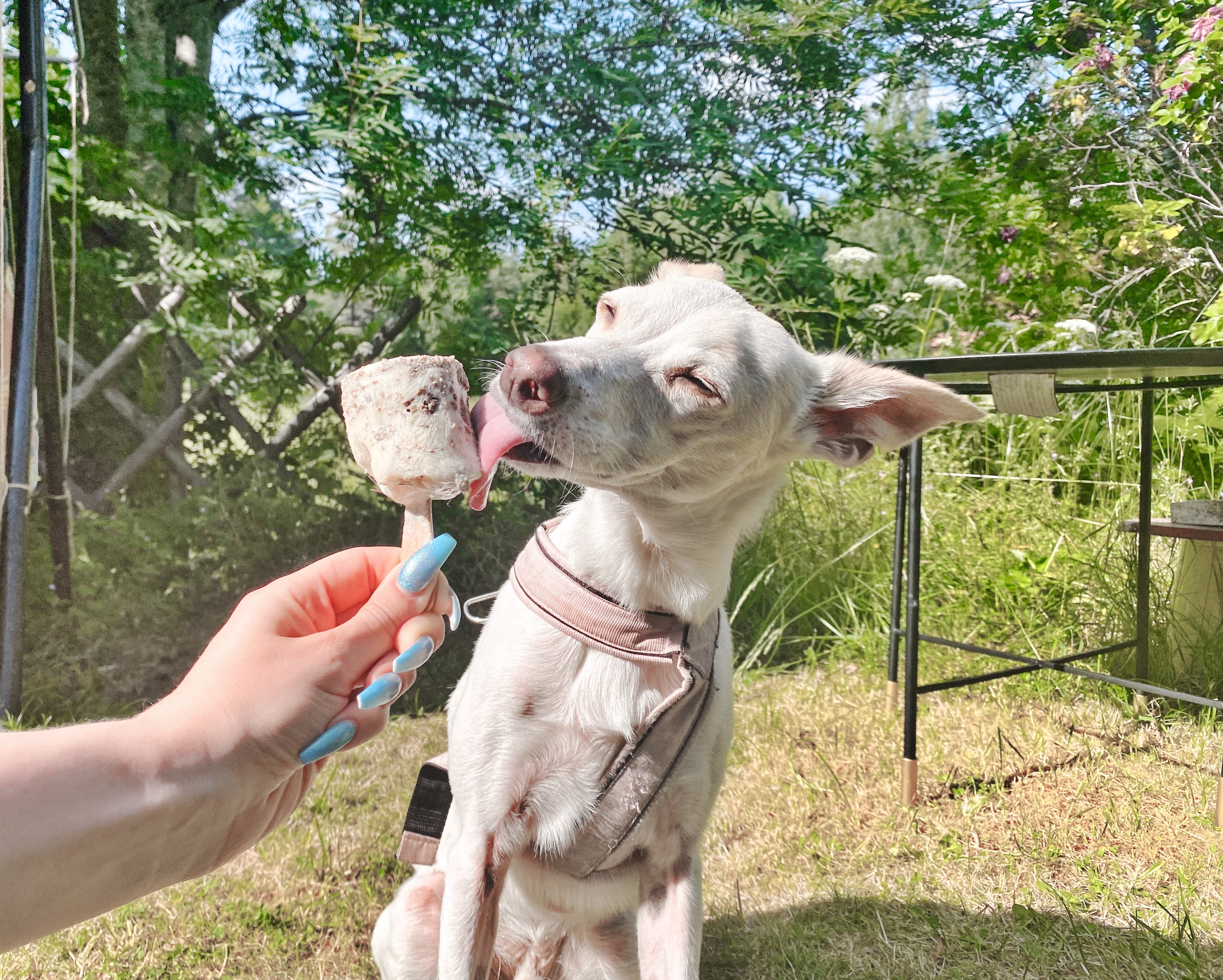 På sommaren njuter vi av glass, varför ska inte vi göra detsamma för våra fyrbenta vänner? Glass är nog ett av de bästa sätten att svalka hunden under de varmaste sommardagarna. Istället för att köpa hundglass kan du enkelt göra det själv hemma. Här är vårt recept på snabb, hälsosam och svalkande glass – godkänt av vår kontorshund Cocos (på bilden).